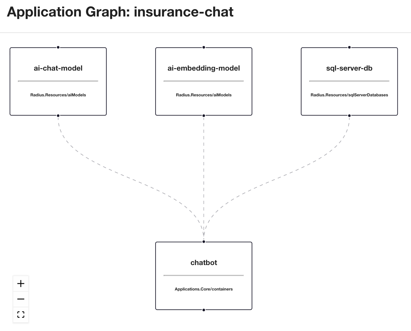 As mentioned above, the developer is able to build a declarative application definition that focuses on the application logic and dependencies without worrying about the underlying infrastructure. For our demo chatbot app, the application definition includes a container for the chatbot service, a SQL Server database for the vector store, and AI models for chat and embeddings, all encapsulated in a single application definition. Radius builds the application graph dynamically based on the resources that get deployed and connections between resources are automatically established.