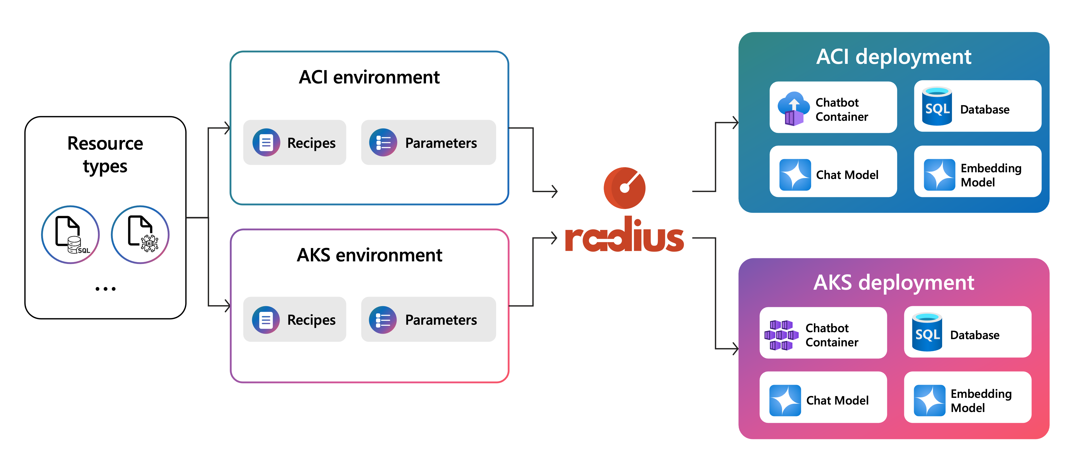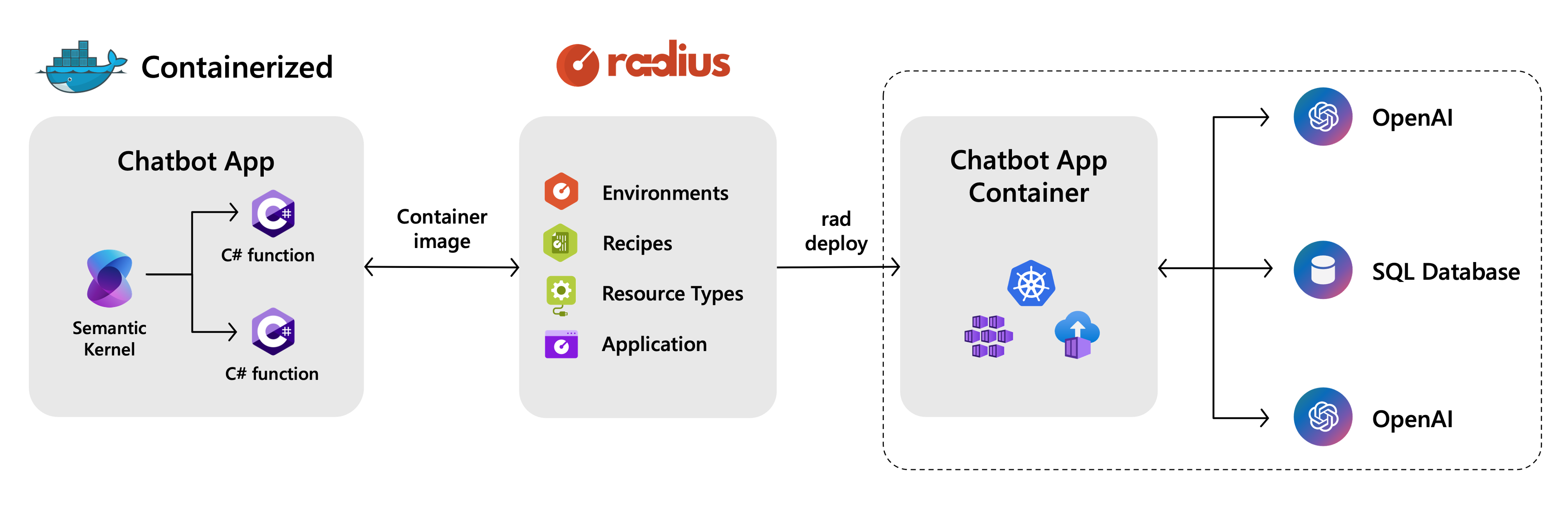 We wanted to illustrate how Radius can streamline the building and deploying of these modern AI workloads, ensuring they are portable, secure, and easy to manage. This brings us to the demo that we’ve built: leveraging Radius to model and deploy the azure-sql-db-chat-sk sample chatbot from the open source Azure Samples repo. This demo illustrates how Radius simplifies the deployment and governance enforcement of intelligent applications across multiple environments. Mark Russinovich presented this demo recently at the Microsoft Ignite conference: